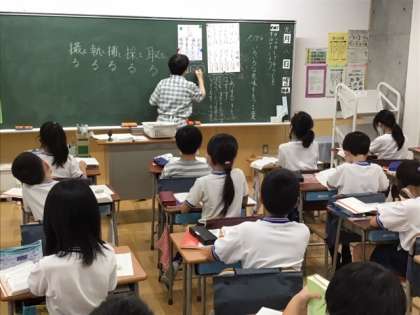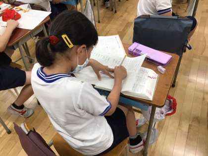 国語の時間です。辞書を使って、いろいろな意味をもつ言葉を調べています。
