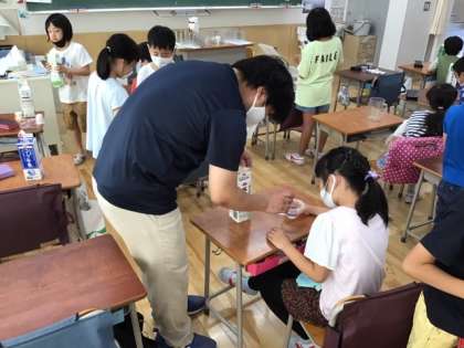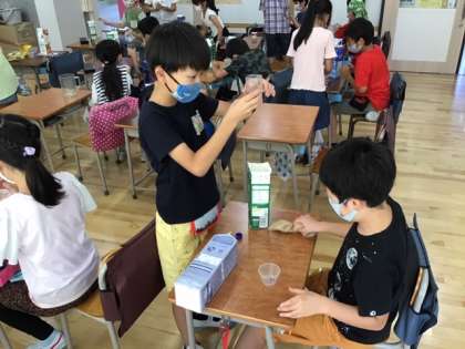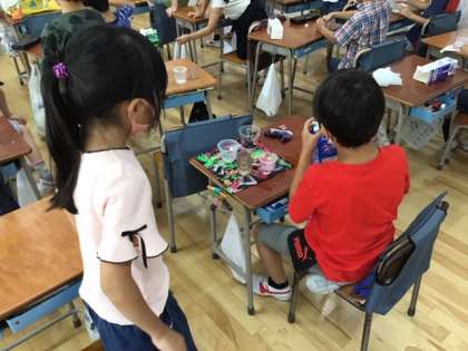 算数の時間です。「かさ」の学習をしています。いろいろな大きさの入れ物を使って、実感しながら学んでいます。
