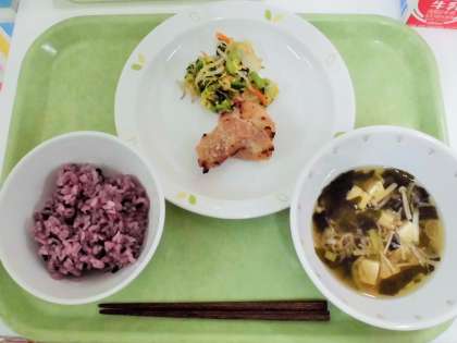 献立 黒米ご飯、鶏肉のみそこうじ焼き、菊花和え、豆腐とわかめのすまし汁、牛乳