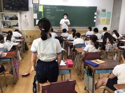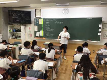 社会科の時間です。「水害からくらしを守る」ためには、どのような工夫があるのかを考えています。