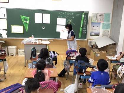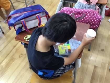 図工の時間です。「キラキラシャボンで」あわから生まれた不思議な形や色を使って、いったい何を作るのかな。
