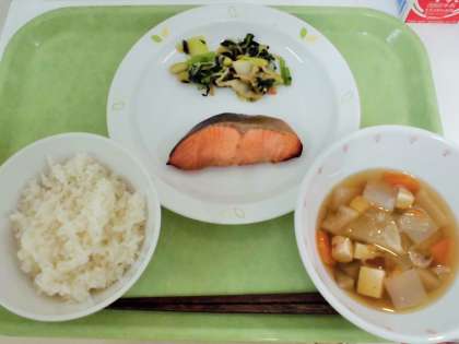 献立 ご飯、鮭の焼きづけ、青大豆入りお浸し、のっぺい汁、牛乳