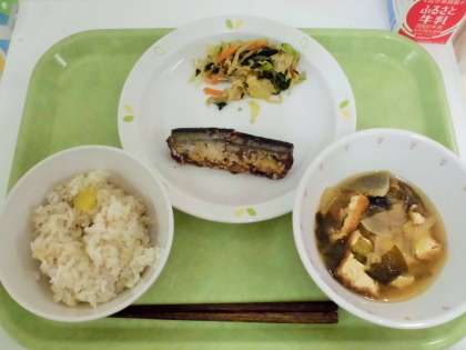 献立 さつま芋ご飯、さんまのしょうが煮、小松菜のお浸し、大根のみそ汁、牛乳