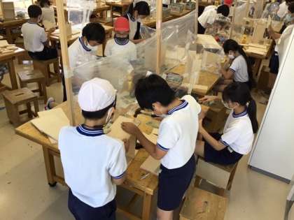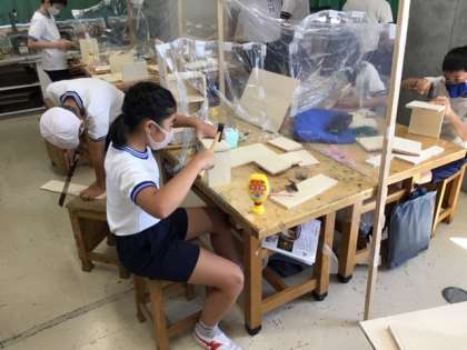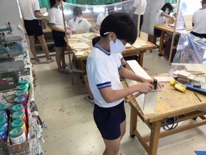 図工の時間です。「12才の力で 私はデザイナー」一枚の板を工夫して生活で使えるものを作ります。