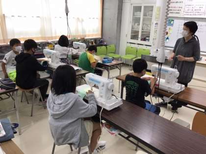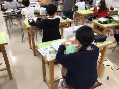 家庭科の時間です。初めてのミシンに挑戦しています。