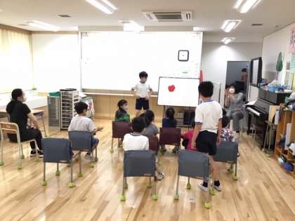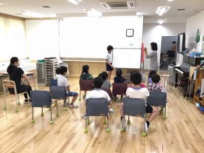 音楽の時間です。リズムに合わせて問題のヒントを出し、答えをみんなで考えています。