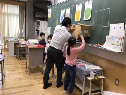 算数の時間です。持ってきた箱を「たいらだけグループ」と「まるいところがあるグループ」に分けていきます。