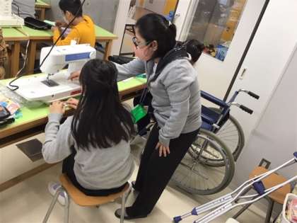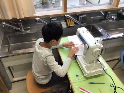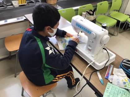 家庭科の時間です。ミシンで雑巾を縫っています。みんな上手ですね。すごい!