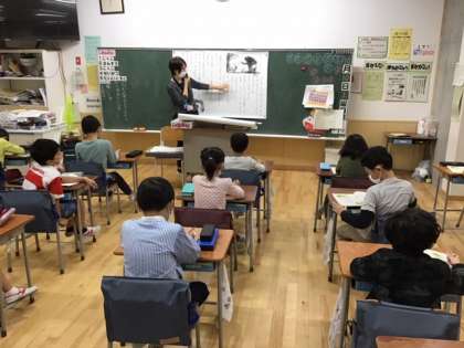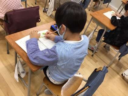 国語の時間です。かえるくんがかたつむりくんに会う場面を楽しく読んでいます。