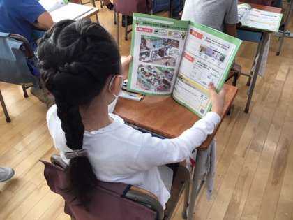 社会科の時間です。東京防災「防災ノート」を活用して、大地震が起こったらどのように行動するか考えています。