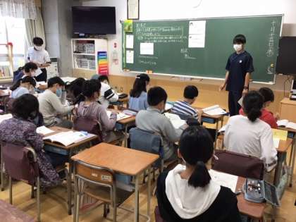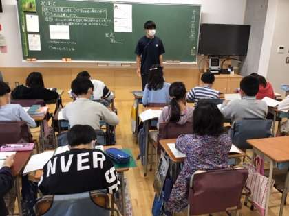 算数の時間です。「平均の求め方」を学習しています。教育実習の先生が、がんばっています。