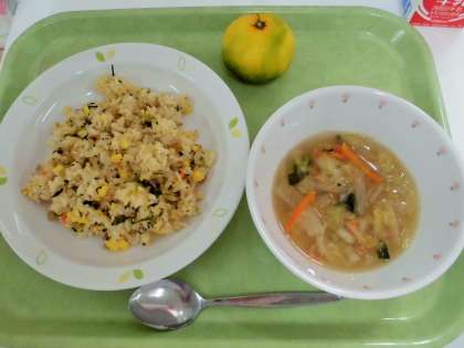 献立 高菜チャーハン、白菜のとろとろ中華スープ、みかん、牛乳