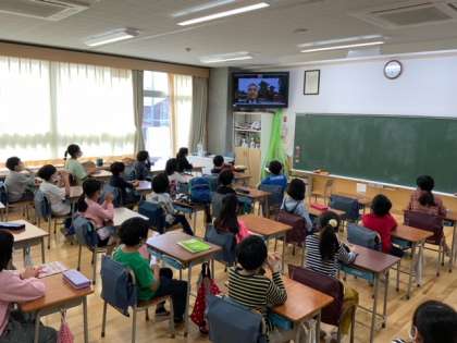 全校朝会を放送で行いました。校長先生はh、京都に全国小学校の校長会で出張中ですが、リモートでの参加です。平安神宮をバックに校長先生からのお話しもありました。