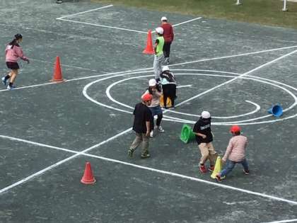 体育の時間です。白組がカラーコーンを倒し、紅組がコーンを元に戻します。さあ、どちらが勝つでしょうか。