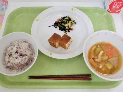献立 ゆかりご飯、生揚げのごまだれかけ、小松菜ののり酢和え、さつま汁、牛乳