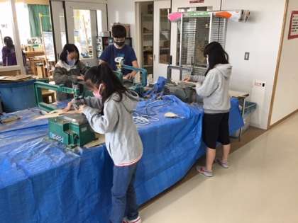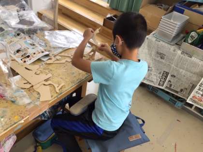 図工の時間です。「糸のこ 寄り道 散歩」くねくねと自在に板を切って、切った形からイメージを広げて組み合わせていきます。