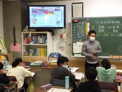 社会科の時間です。室町時代の文化の特色について考えています。今に伝わる芸術がたくさんありますね。