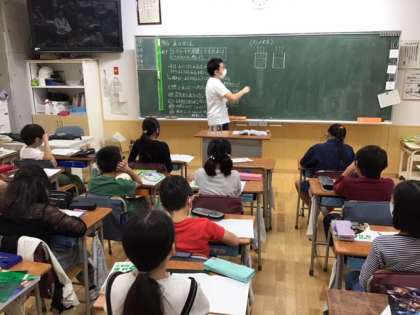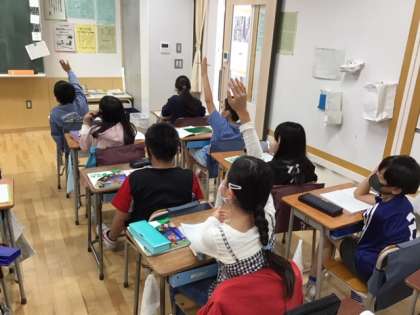 理科の時間です。地面やコンクリートにたまった水はどうなるかを考えています。