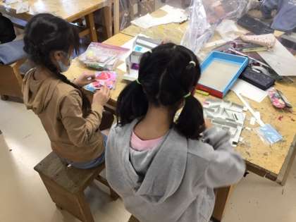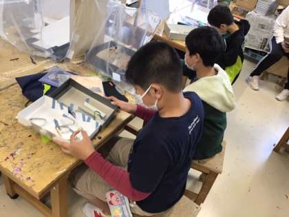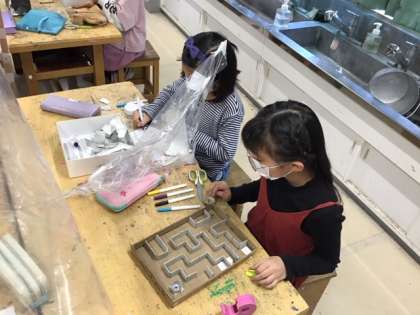 造形クラブの活動の様子です。「ビー玉迷路」作成中です。