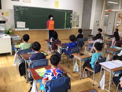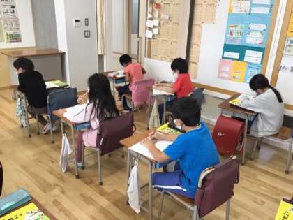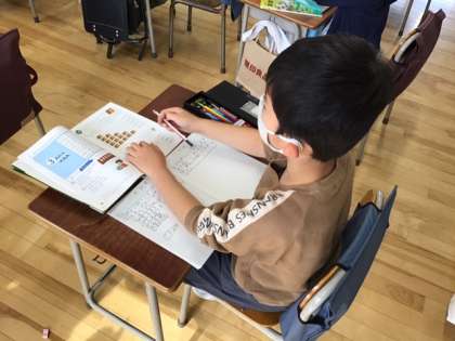 算数の時間です。3の段の復習をしたあと、4の段に取り組みます。