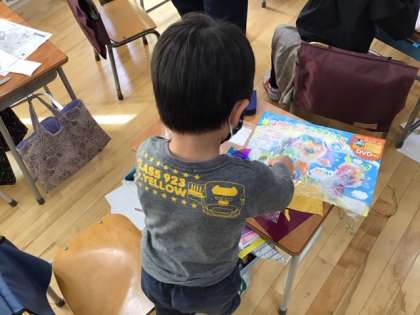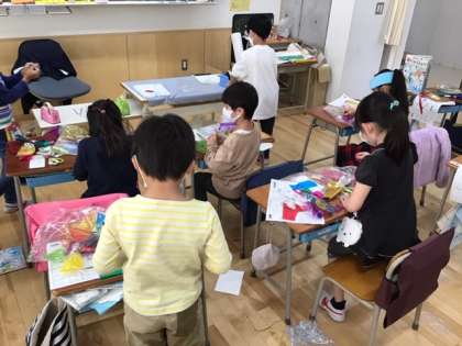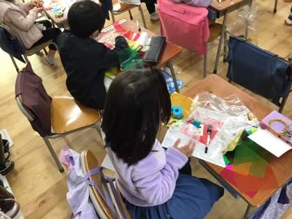 図工の時間です。「ひかりのくにのなかまたち」キラキラしてとてもきれいですね。