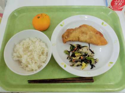 献立 ご飯、ジャンボぎょうざ、ひじきとじゃこのサラダ、みかん、牛乳