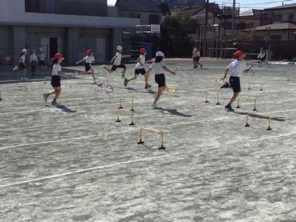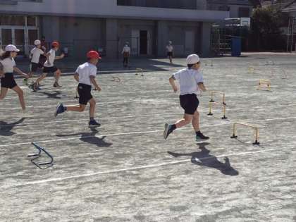 体育の時間です。ミニハードルを使って、ハードル走に挑戦しています。