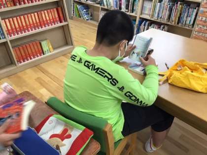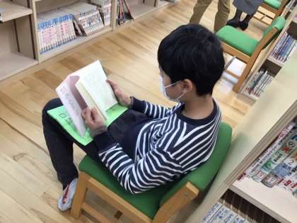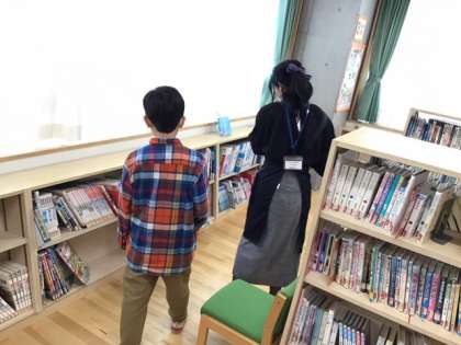 読書の時間です。司書の先生にいろいろ相談しています。