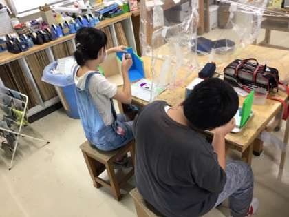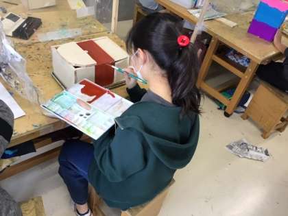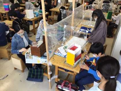 図工の時間です。一枚の板から、様々な作品が出来上がっています。