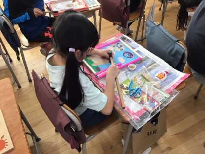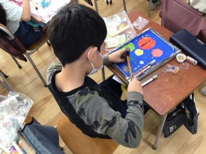 図工の時間です。「手作りパチンコ」も、くぎ打ちに入りました。完成間近です。
