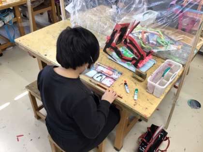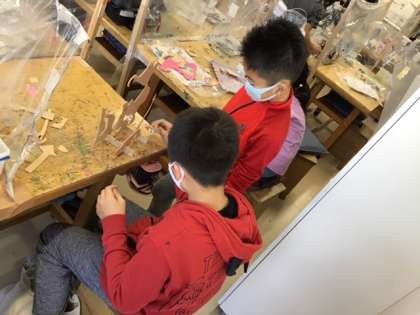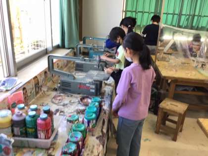 図工の時間です。「電のこ 寄り道散歩」子どもたちの豊かなアイデアが光っています。