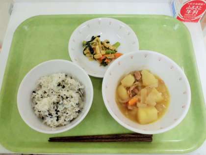 献立 わかめご飯、塩肉じゃが、カリカリ豆腐のサラダ、牛乳