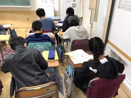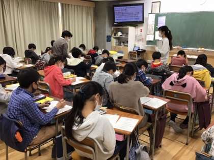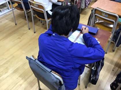 外国語の時間です。文字を読んだり書いたりすることにも、すっかり慣れましたね。