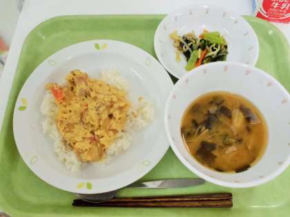 献立 親子丼、小松菜のおろし和え、じゃが芋のみそ汁、牛乳