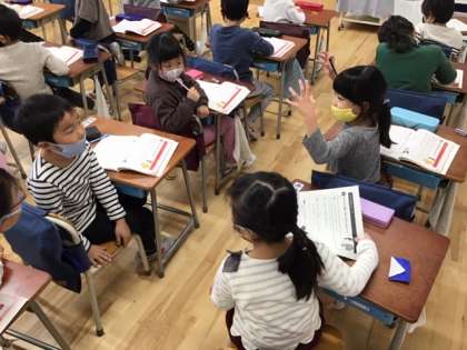 日本語の時間です。なぞなぞを楽しんでいます。「え〜、むずかしい。」