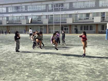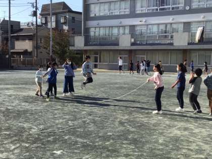 学習発表会のスポーツチームは、長縄跳びのいろいろな跳び方に挑戦しています。