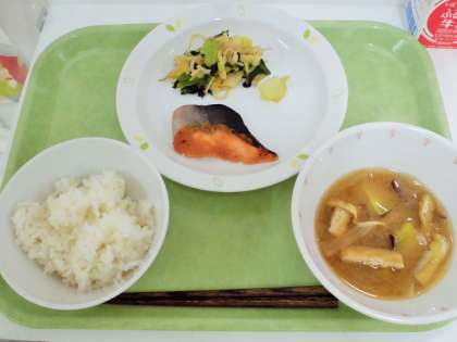 献立 ご飯、鮭のもみじ焼き、小松菜とえのきのお浸し、さつま芋のみそ汁、牛乳
