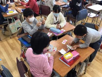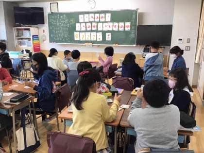 算数の時間です。「分数トランプ」を使って、楽しみながら学習を深めています。