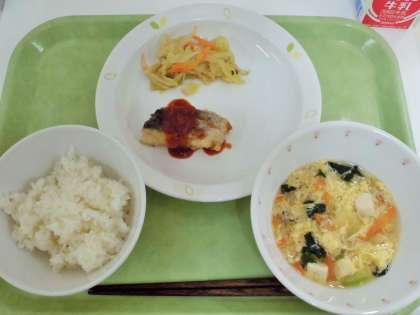 献立 ご飯、白身魚のチリソース、野菜の甘酢和え、かきたま汁、牛乳