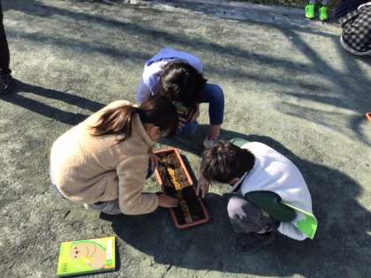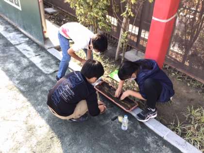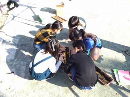 理科の時間です。手作りの実験装置を使って、水の流れのはたらきについて調べます。
