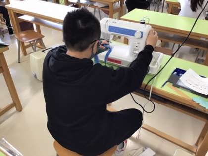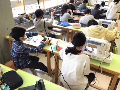 家庭科の時間です。マイバッグの仕上げと自由作品づくりをしています。