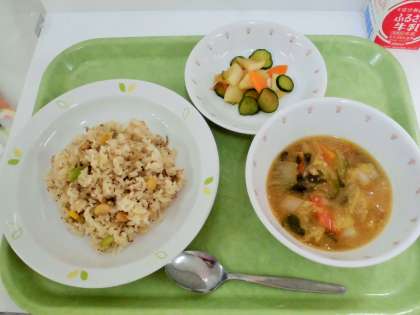 献立 まめじゃこチャーハン、かぶときゅうりの中華和え、白菜のタンタンスープ、牛乳