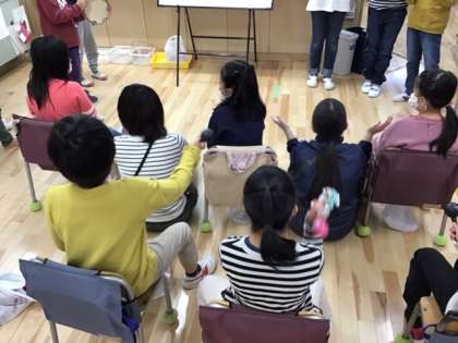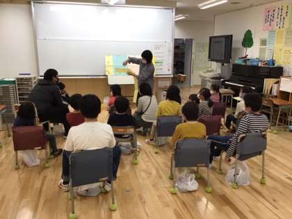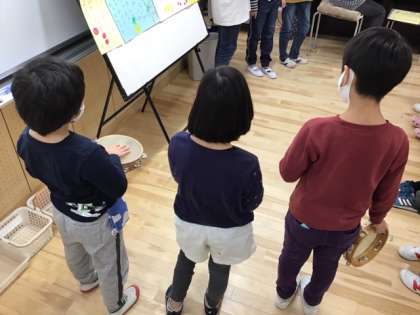 音楽の時間です。「いろんな きのみ」みんなの息がぴったり合っています。