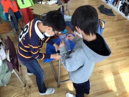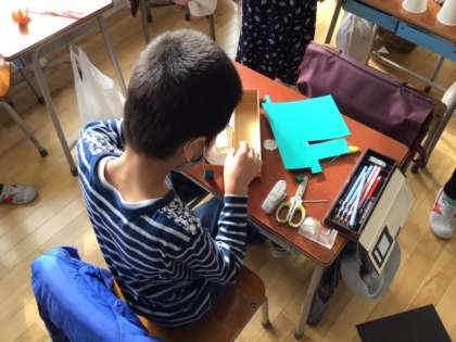 国語の時間です。まず、自分で考えたおもちゃを作ります。その後、おもちゃの説明書を書きます。