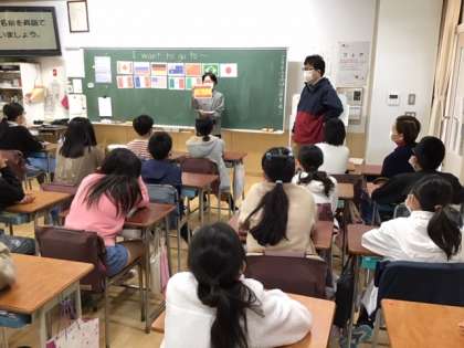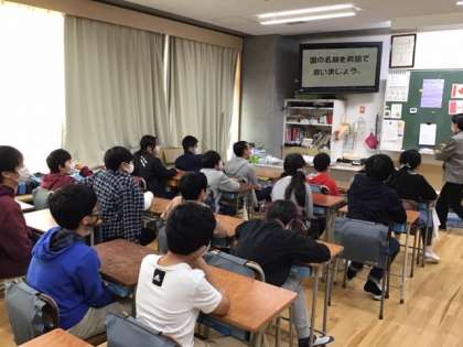 外国語の時間です。国旗を見ながら、国の名前を英語で言っていきます。