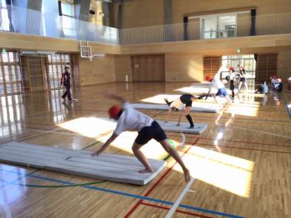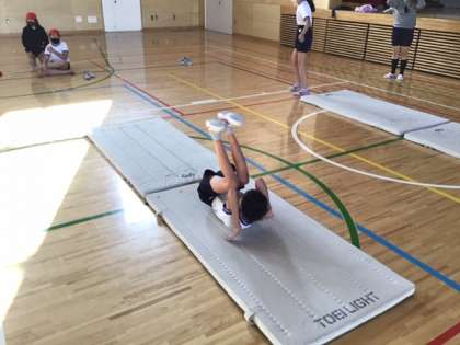 体育の時間です。体育館では、「マット運動」に挑戦しています。