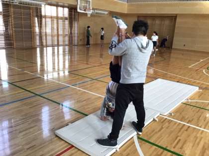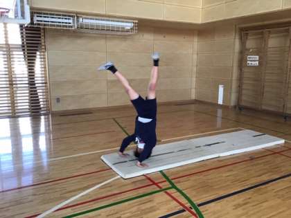 体育の時間です。倒立前転に挑戦しています。
