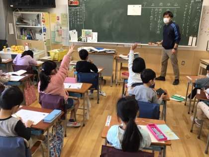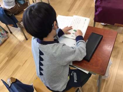 国語の時間です。絵を見ながら、習った漢字を使って文を作っています。習った漢字が増えましたね。