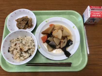 献立 大根葉ご飯、大蔵大根おでん、甘辛ごぼう、牛乳