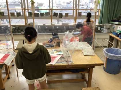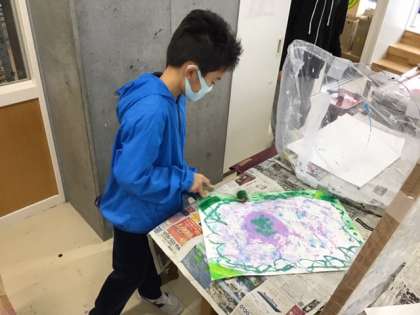 図工の時間です。「進め! ローラー大冒険」複雑で不思議な模様の下地が出来上がっています。
